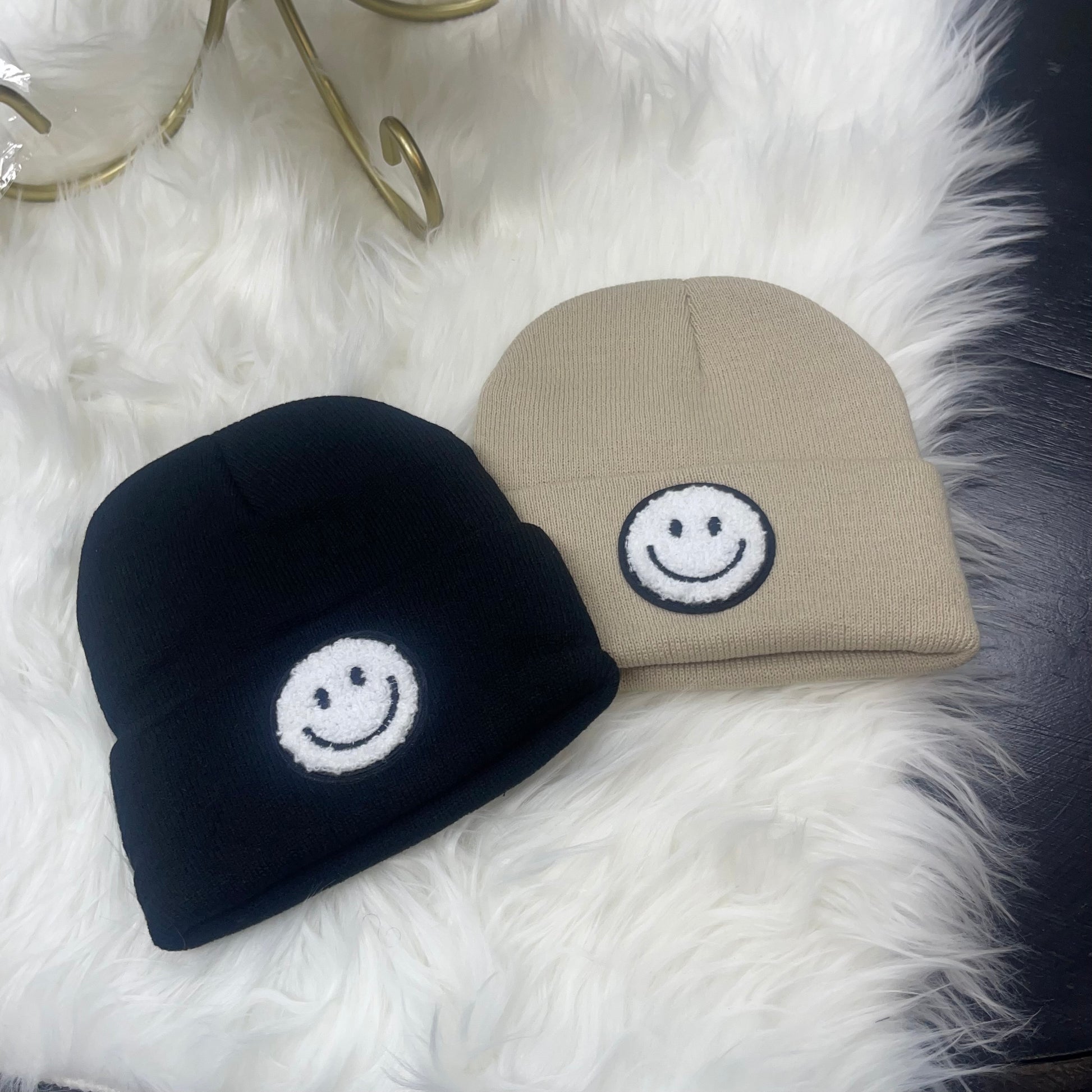 Kidswear beanies featuring a soft fuzzy smiley face patch, perfect for the upcoming fall and winter seasons!
